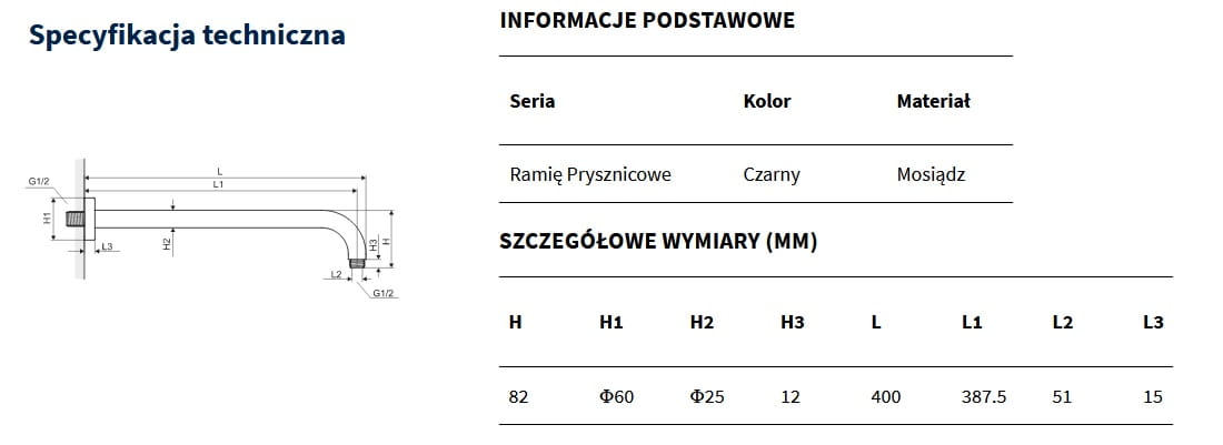 Ramię prysznicowe ścienne okrągłe o długości 400mm wykonane z mosiądzu. Produkt posiada elegancką rozetę do montażu ściennego. Ponadto ramię ścienne wyposażone jest w dodatkowy element montażowy zapewniający lepsze zamocowanie produktu w ścianie. Posiada standardowego rozmiaru przyłącza, pozwalająca na dopasowanie wybranej głowicy prysznicowej " deszczownica "