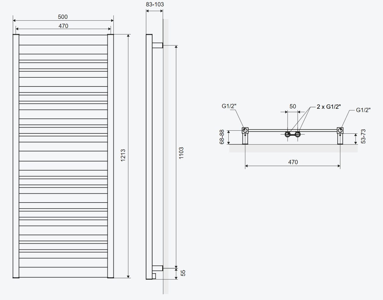 Grzejnik został wyposażony w zestaw otworów, pozwalających na podłączenie go zarówno w wersji dolnej centralnej (50 mm w osi dla zestawów zaworów zintegrowanych), jak i dolnej skrajnej na kolektorach (470 mm). Grzejnik tej wyposażony w grzałkę elektryczną, sprawdzi się doskonale jako całoroczna suszarka na ręczniki, zapewniająca ogrzewanie pomieszczenia i możliwość suszenia tekstyliów nawet poza sezonem grzewczym.