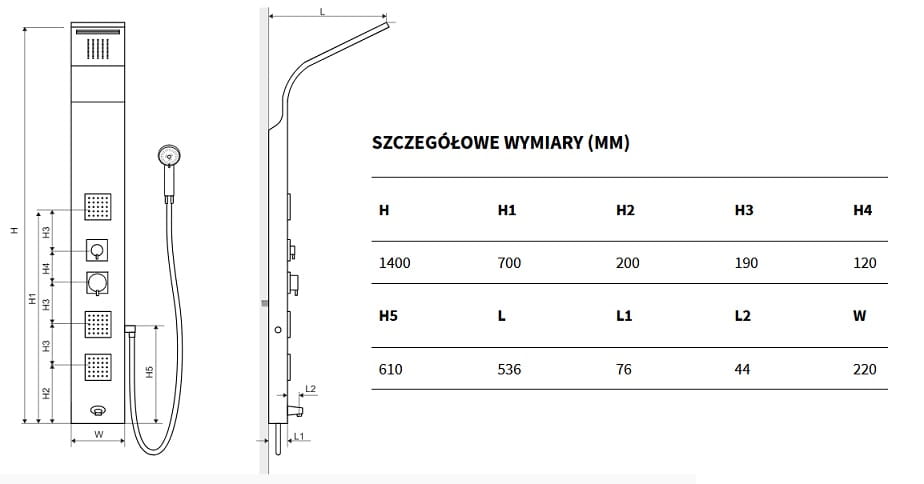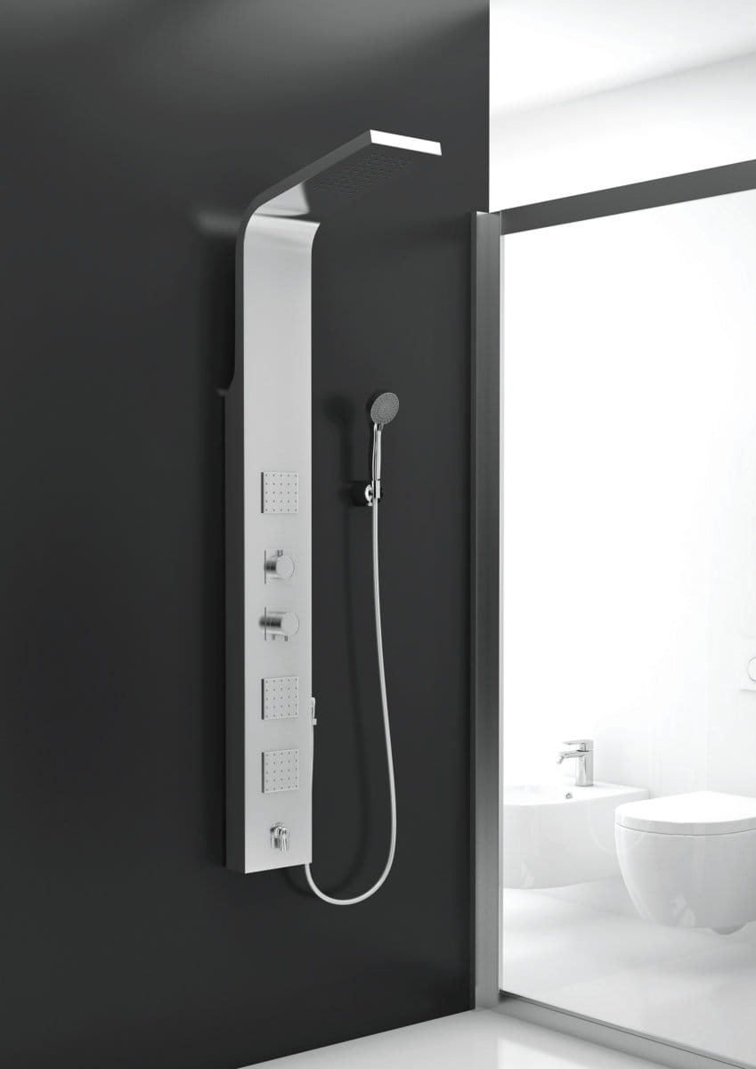 Główną zaletą panelu MORE jest aż 5 źródeł wody :głowica górna + kaskada, słuchawka prysznicowa, 3 dysze natryskowe oraz wylewka wannowa. Panel wykonany ze stali szlachetnej. Istnieje również możliwość montażu narożnego. Panel More będzie świetnie pasował do nowoczesnych kabin prysznicowych.
