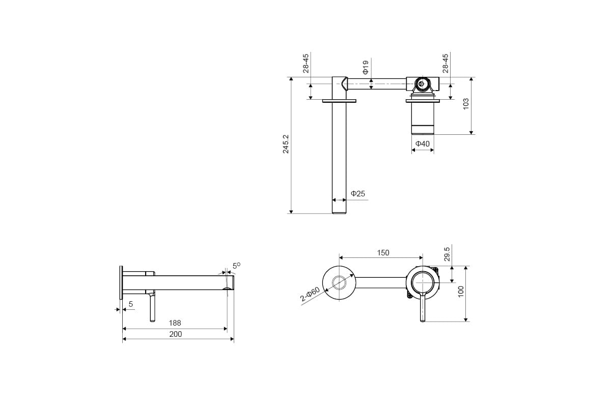 Bateria umywalkowa podtynkowa Pi wykonana jest z mosiądzu. Posiada wylewkę o długości 188mm (od rozety ośrodka perlatora) oraz dwie ozdobne rozety, które zakrywają element podtynkowy. Bateria jest montowana podtynkowo i dzięki temu jest idealnym rozwiązaniem do umywalek bez otworu na baterię oraz takich, które wymagają dopasowania wysokości wylewki do głębokości i wysokości misy. Posiada uchwyt, który skrywa głowicę Kerox w postaci „joysticka”. Zastosowany perlator Neoperl Slim jest niemal niewidoczny dzięki schowaniu go we wnętrzu wylewki.