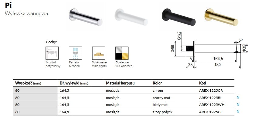 Wylewka wannowa Pi. Linia baterii PI to szeroka grupa armatury powstała z dbałością o każdy detal. Wyróżnia się jakością wykonania oraz zastosowanymi rozwiązaniami funkcjonalnymi. Dużą zaletą linii Pi jest jej dostępność w 4 najmodniejszych kolorach: klasycznym chromie, czystej bieli, dostojnym złocie oraz eleganckiej matowej czerni. Nazwa Pi wywodzi się od liczby π, a oznacza ona wielkość proporcji pomiędzy rozmiarami ważnych elementów każdej baterii np. długość korpusu/długość uchwytu itp. Dzięki tej naturalnej proporcji stosowanej intuicyjnie już od starożytności , linia baterii Pi zachwyca spójnością wyglądu która wynika z logiki matematycznej ukrytej już na etapie projektowania. Linia baterii PI została opatentowana i podlega ochronie na terenie całej Unii Europejskiej.