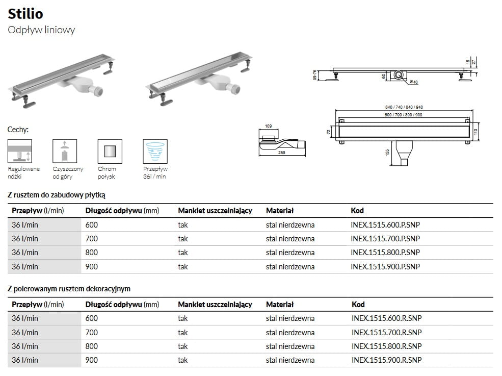 Odpływ liniowy Stilio łączy w sobie minimalizm i praktyczność użytkową. Wykonany został z wysokiej jakości stali nierdzewnej. Odpływ posiada wygodną regulację nóżek w pionie i w poziomie w zakresie do 30mm. Szeroki wybór dostępnych rozmiarów odpływów i wersji rusztu daje możliwość dostosowania do wielkości kabiny oraz wymiarów płytek, co znacznie ułatwia planowanie układu już na etapie projektowania. Produkt polecany jest do instalacji wraz z kabinami Excellent , Radaway , Huppe , New Trendy , Omnires , Ravak , Koło , Roca , Sanplast i itd.
