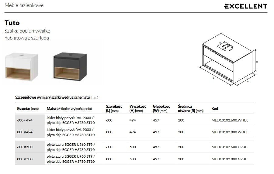 Szafki pod umywalki nablatowe Tuto wykonane są z najwyższej klasy płyt meblowych austriackiej firmy Egger. Dla modeli z jedną szufladą, dostępne są w ofercie płyty koloru: biały lub szary, które w połączeniu z półkami w kolorach: biały, beton lub dąb, nadają wnętrzu ponadczasowej klasy i elegancji.