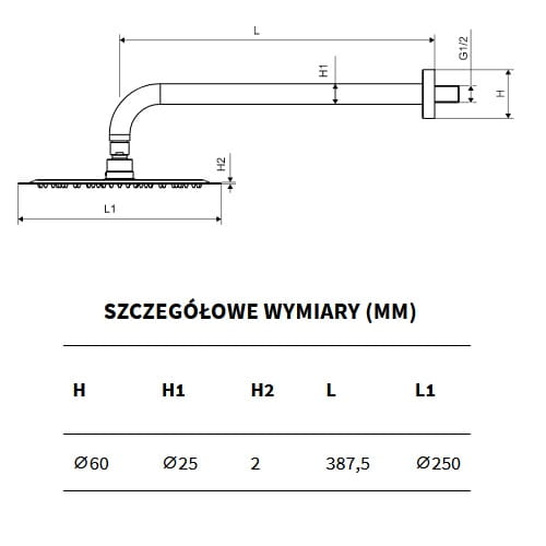 Ramię prysznicowe ścienne okrągłe o długości 400mm wykonane z mosiądzu. Produkt posiada elegancką rozetę do montażu ściennego. Ponadto ramię ścienne wyposażone jest w dodatkowy element montażowy zapewniający lepsze zamocowanie produktu w ścianie. Posiada standardowego rozmiaru przyłącza, pozwalająca na dopasowanie wybranej głowicy prysznicowej " deszczownica "