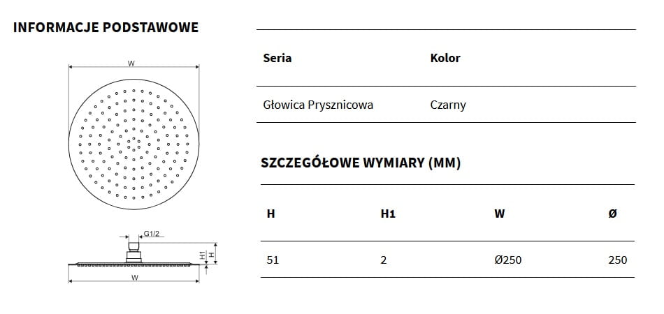 Głowice prysznicowe to idealne rozwiązanie do strefy prysznica – w kabinie lub wannie z parawanem. Dzięki nim możliwa jest relaksująca kąpiel pod dużym strumieniem wody w formie deszczu. Okrągła deszczownia wykonana ze stali nierdzewnej w kolorze czarny mat o wymiarach Ø250mm i grubości 2mm. Dostępna także w innych rozmiarach czy kolorach.
