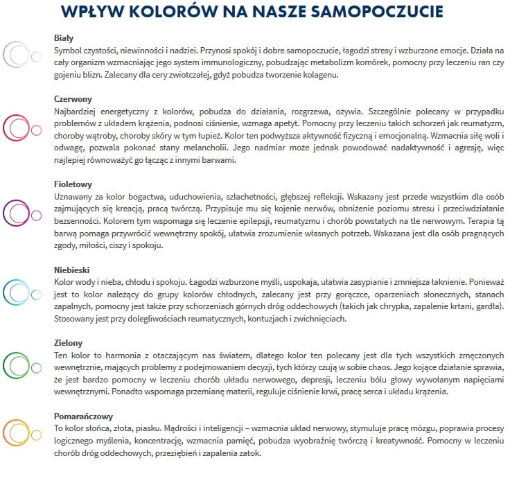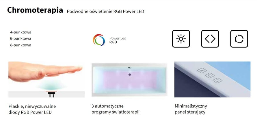 System oferuje 3-stopniową regulacją natężenia światła oraz możliwość wyboru jednego z trzech automatycznych programów chromoterapii. Dodatkowym elementem jest zainstalowany czasowy wyłącznik oświetlenia.