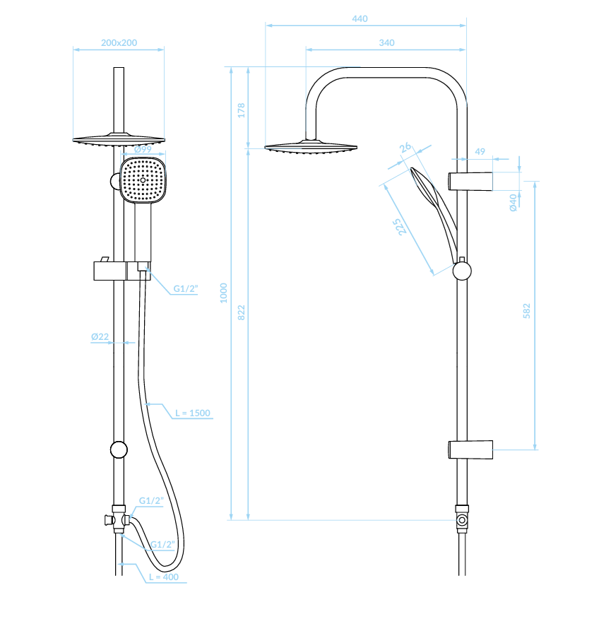 - wyjście prysznica na dole 1/2" ze zintegrowanym zaworem zwrotnym