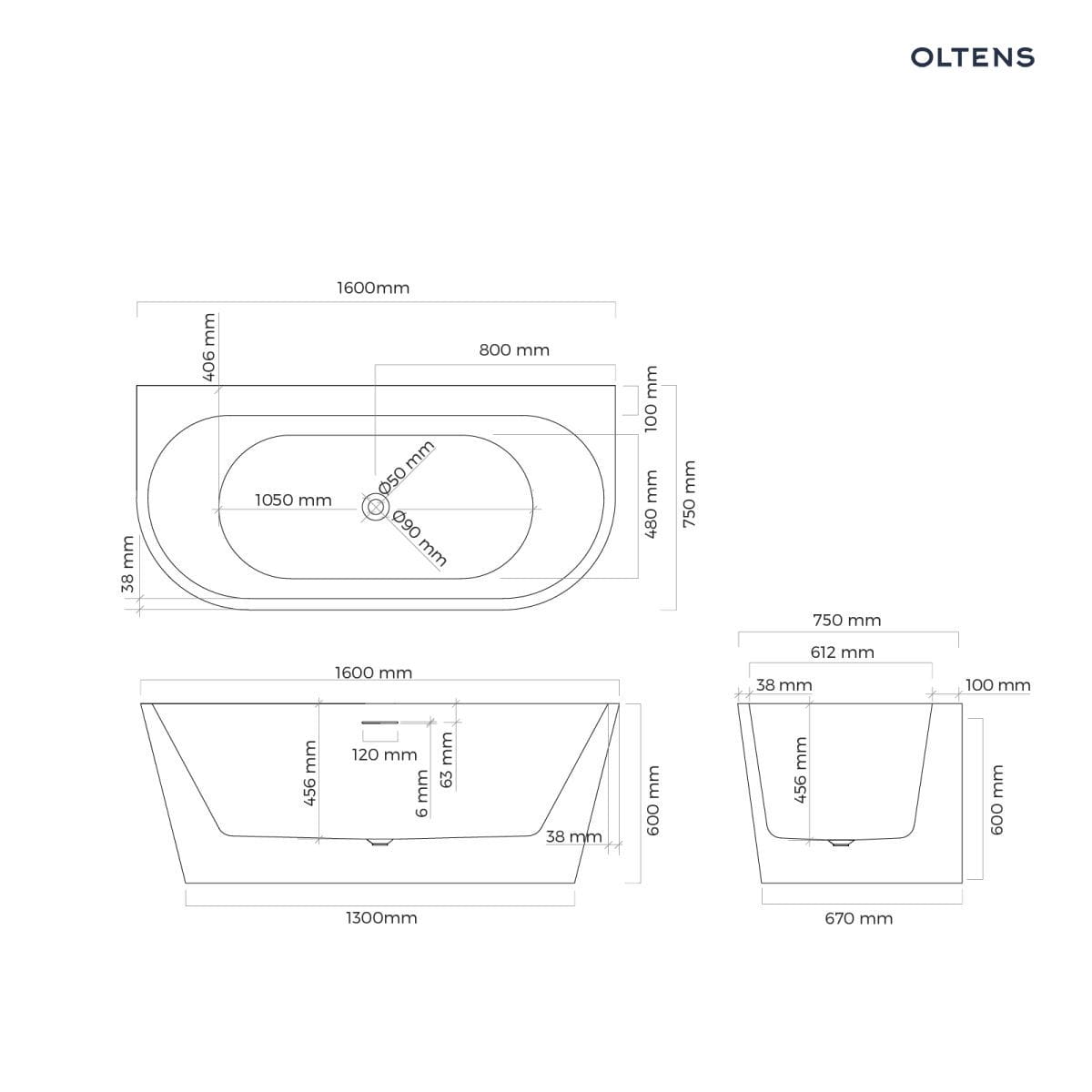 Oltens Hulda wanna wolnostojąca 160x75 cm przyścienna , kolor biały połysk