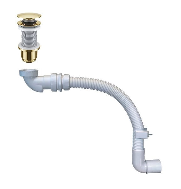 Purus Pum syfon umywalkowy lub bidetowy suchy biały z rurą elastyczną i korek Click-Clack złoty szczotkowany