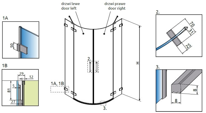np. PDD80 LEWA + PDD90 PRAWA = KABINA Z PODWÓJNYMI DRZWIAMI O ROZMIARZE 80x90cm